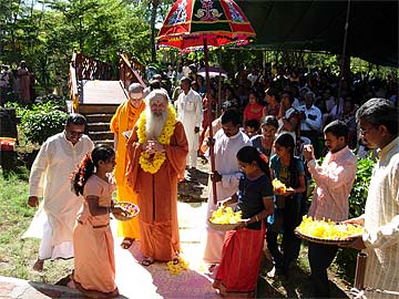 Paramacharya Palaniswami and Yogi ceremoniously welcomed at the steps of Ganesha Mandapam....