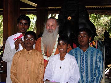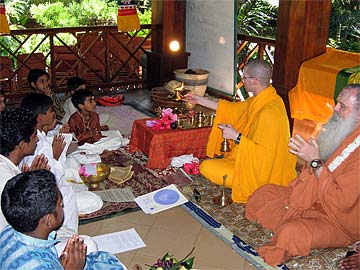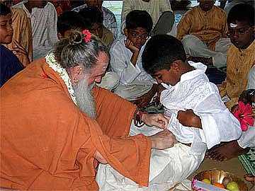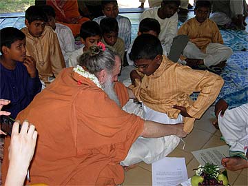 " I seek the blessings of God, Gods and guru as I declare of my own volition my firm intention to live a pure and virtuous life and now take this brahmacharya vrata. Then Paramacharya Palaniswami chanted a powerful mantra and passed the sacred flame on each of the boy's head...