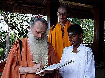 Paramacharya Palaniswami is signing Sivarathna's book "Saivite Virtue" that he will be daily reading for his brahmacharya sadhana.