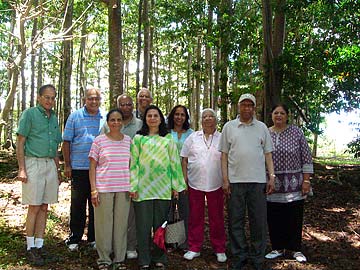A group photo in the Rudraksha Forest of today's visitors. (center back) are Mahendrabhai and Hansaben from London, UK and Suresh and Sumi Patel from Surrey, UK. They are related to Jayantibhai and Viraben, Vinod and Kapula Patel, and Rames Upadhayay who are all from New Jersey.