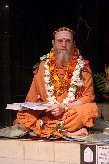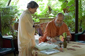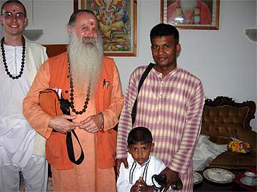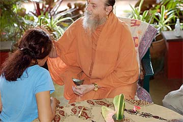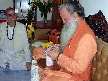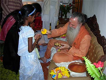 Brahmachari Vel offered a gift to Paramacharya Palaniswami.... some chocolate that swami will later lovingly distribute to the children present.