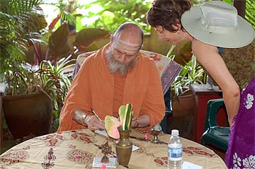 A number of the Hindu guests came forward, not for autographs, but for darshan and blessings from the Satguru. Bodhinatha gave them vibhuti...