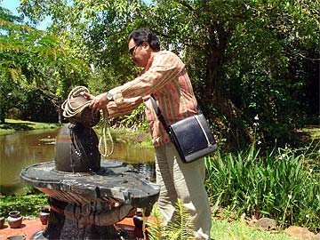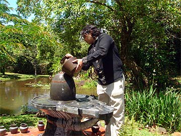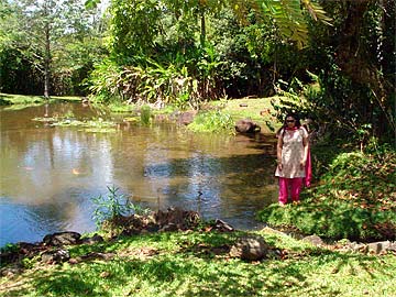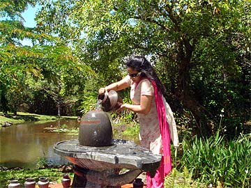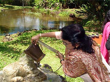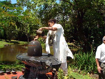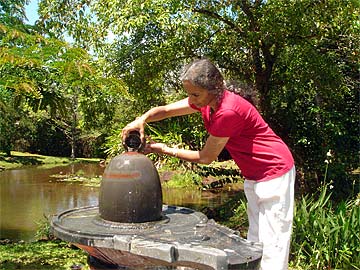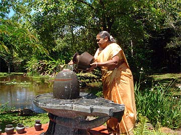 Following the 9 a.m. puja, the Ilankovan Family and another couple from Chennai, Mahadevan and Radha Hariharan from Texas, visited the lotus ponds where everyone performed abhishekam to the Narmada Lingam - with Suseela being the first.