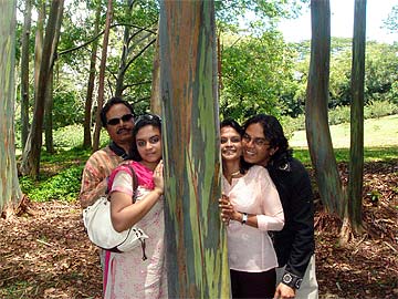 Kolandavelu Ilankovan, Sharmini, Ashok and Kala posing with a rainbow eucalyptus tree.