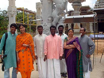 Far right, Gowri and Anadan Navanandan from Boston, Mass. where Anadan is an Engineer. Both are originally from villages near Jaffna, Sri Lanka. Next to them are Vellaiasamy, Pandi, and Manikandan, three of our expert silpis.