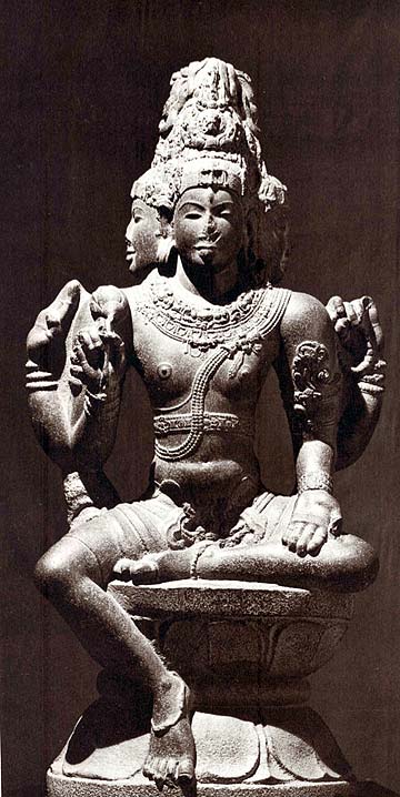 This is one of the most explicit statements of monism and monistic theism in Hindu art. Unlike the popular - and erroneous - concept that Hindus worship a "trinity, " it shows that the Supreme being can be seen as many, usually Brahma-Vishnu-Rudra, but in essence He is One Being.
