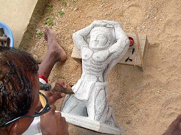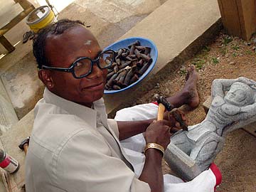 Chelliah, one of our skilled silpis, was found hard at work creating a Hawaiian figure handcarved out of white granite. It is a Menehune, a hawaiian counterpart to Hindu bhutas.