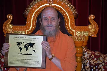 Bodhinatha holds a Hindu Renaissance Award plaque that will leave for Sri Lanka next week. It says: