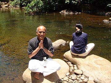 Sudarshan and Valli his wife meditate on the sacred Wailua River following a morning in the beautiful and very spiritual Kadavul Siva Temple.