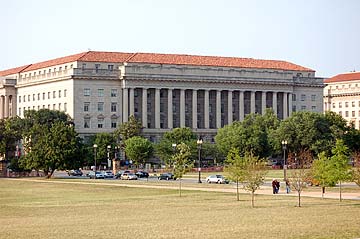 A look back toward the city. A giant building with typical Washington D. C. architecture.