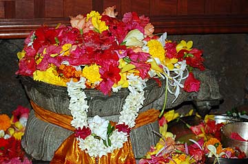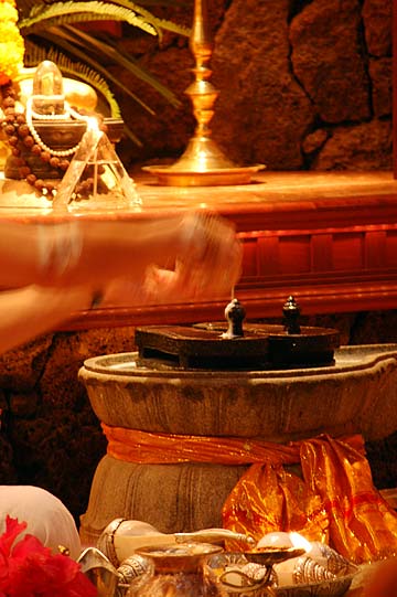 Dr. Rajni Jani and his wife Ranna performed abhishekam to the Narmada Lingam beside the lotus ponds this morning before departing for their home in Fort Worth,Texas.