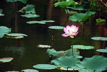 After many years of trying unsuccessfully to grow lotuses in our ponds (the fish kept eating the roots) they are taking off in the ponds along the Path of the Saints. We think it is because we are now feeding the Koi daily and they are so plump and happy that they leave the plants alone. Another theory is that the root system developed underneath grassy bog areas inaccessible to the fish and now the lotuses are "growing like crazy" popping up everywhere and will soon fill the ponds like they do in Asia.