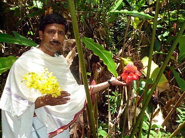 He holds the sacred Konrai blossoms from India in his right hand while admiring the pink torch ginger flower native to Hawaii.