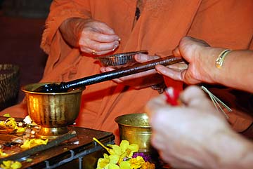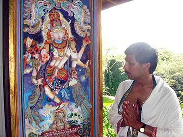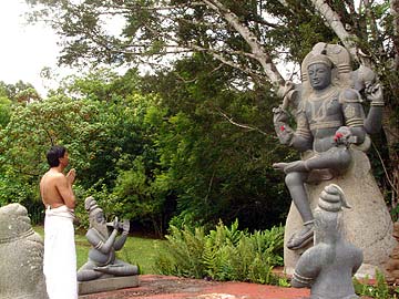 Srinivasan Chandrashekharan, a brahmin, is here on a short pilgrimage from San Francisco. Following the morning puja and worship in the Kadavul Siva Temple, he was taken on a tour of the Iraivan Temple and grounds. Here he worships beside the granite Vel on Muruga Hill along the pilgrim's path. San Marga the straight path to God.