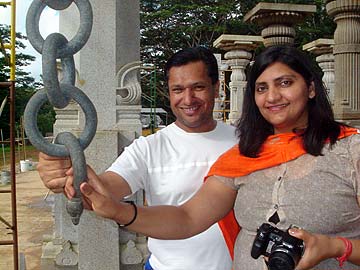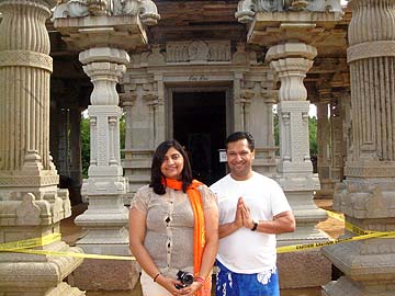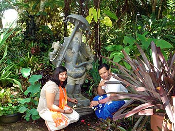 Rakesh and Pranika in front of the very beautiful granite Umbrella Ganesha on their return for the