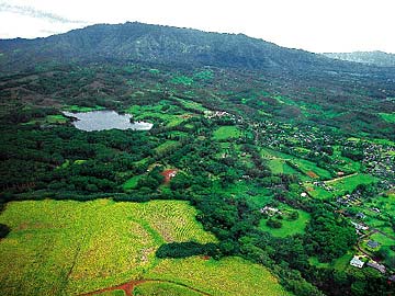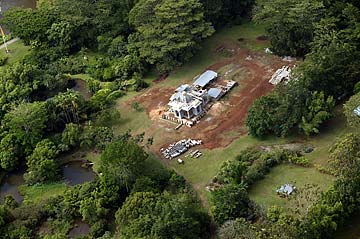 A view from a helicopter shows Iraivan two years ago, nestled in the tropical forest of Kauai, with the ponds and palms on the north side.
