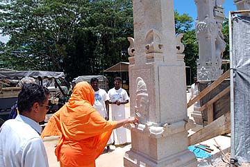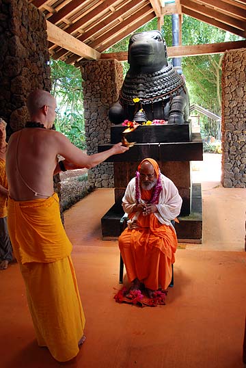 Swami was greeted in the traditional manner at the temple.