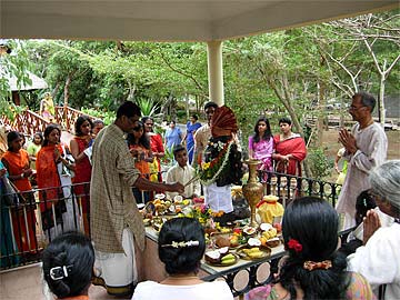 The first devotees arrive at the small Pancha Mukha Ganapati Shrine where sishyas lovingly attend to their offerings.... At peak moments a huge crowd is seen around this shrine....