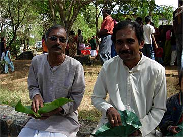 Bala and Poobarlene having some lunch after a busy time helping at the small Ganapati Shrine.