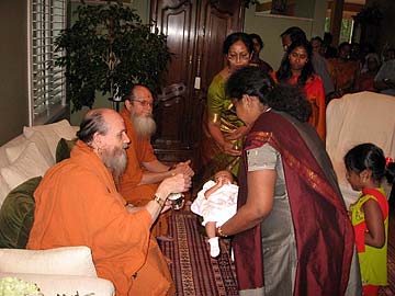 Satguru Bodhinatha is blessing a 1 month old Sumithra Luxmi Sivakadadsan.