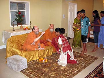 Satguru Bodhinatha is blessing Kirthika Jeyendran and other devotees.