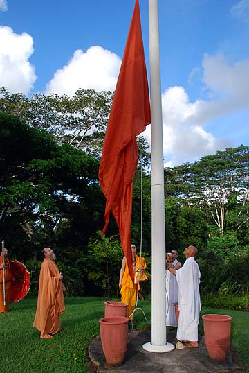 During Jivana Ritau, the rainy season, from mid-August to mid-December, Living with Siva: Hinduism s Contemporary Culture is the primary text. The key word of this season is work. The colors are rust, copper-maroon and all shades of red rust for earthy preservation, copper-maroon for fulfillment and red for physical energy. The Aadheenam's 40-foot flag pole flies the rust-colored dhvaja, symbolizing environmental care. Copper-maroon and all shades of red adorn our smaller flags.
