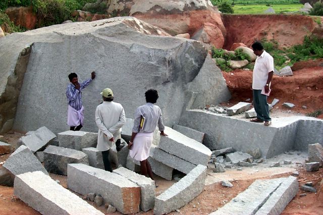 Did you ever think that Iraivan was a new temple? Perhaps, but keep in mind that the stones are millions of years old! This photo was taken at the quarry outside of Bengalulu (the new name for the city of Bangalore) where Iraivan stones are cut from the bedrock.