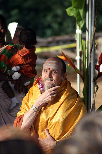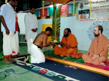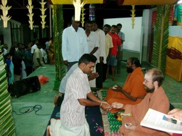 Five hundred people came forward for vibhuti prasadam, a small picture of Gurudeva and a flyer explaining the yamas and niyamas in Tamil. It was at least four times the number of people that came to any of the other temples we visited and gave our presentation at.