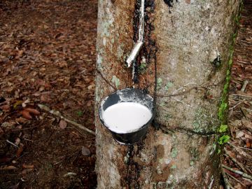 On Friday we had a quiet, relaxed day at the Rubber Research Institute. On a walk around the plantation, we stopped and examined some freshly tapped trees. Here is a full cup of latex.