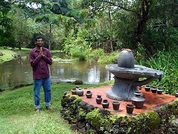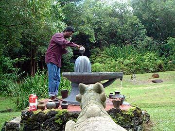 Manikandan prays after placing a flower on the Siva Lingam which represents Parasivam, the formless aspect of God Siva.