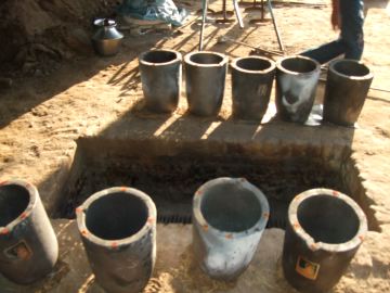 Here are some of the clay melting pots that are used for the metal. In the middle is a big fire pit that they will be placed into to heat up.