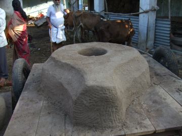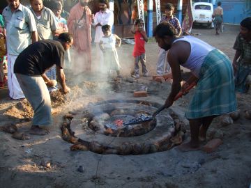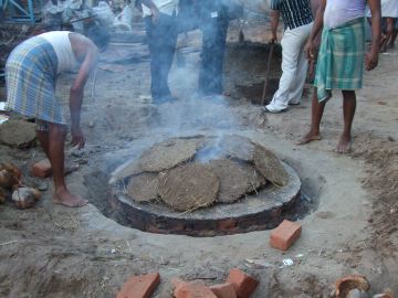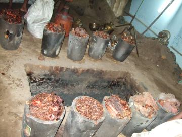 The mold is heated up to 700° so that it does not crack when the 1,000° molten metal is poured in. This is done by placing hot coals, coconut husks and dried cow dung into the mold, which will burn for two hours.