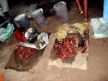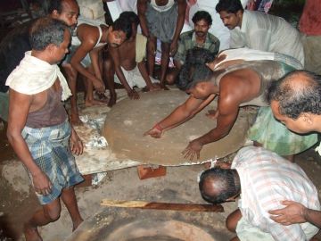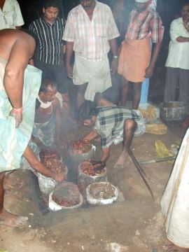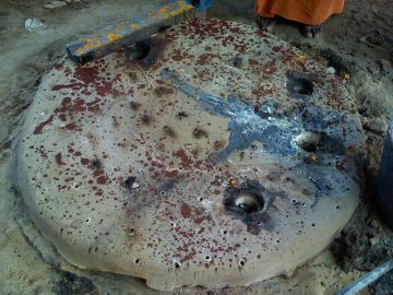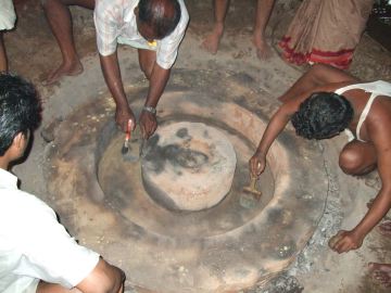 The next morning we returned to check the progress, and we learned that it took up until 2:00am. Casting is always done at night because the whether is cooler then. As the process is a very hot one, it would be unbearable to do during a hot South Indian day any time of the year. Here is the funnel, now quite a different color. The red splotches on top are from turmeric water that was sprinkled on the funnel to purify the atmosphere during the casting. The heat turned the turmeric red. You can also see some metal on top of the hole that was used for pouring. We broke off a piece to bring home.