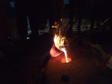 Hot coals were placed in the bottom of the two forging fire pits. Finally the sixteen pots full of metal (a huge amount) were finished being packed, very tightly, and were lowered into the pits. Bags and bags of coal were poured in to surround the pots, and an overflow of old metal pots which would also be used in a second round were placed on top of each array of melting pots with a big sheet of metal to contain the heat. The blowers were started. Later, the fires were raging, quite colorfully because of all the different kinds of metal. At about 10:30pm we departed, having done our ceremonial part and witnessed most of the process.