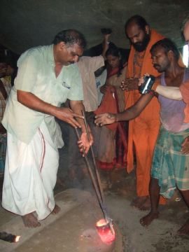 Finally, the first ceremonial cup of metal is ready. Yoginathaswami places two gold coins into the red-hot and flaming cup of liquid, which disappear instantly. It is mixed for a moment and then carefully poured through a hole in the funnel.