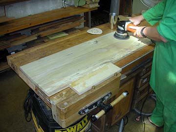 Meanwhile Sivakatirswami is building custom bookshelves out of 100% Rudraksha wood. The wood comes Ffrom rough milled lumber harvested from our own property. The monastery plants thousands of trees each year and has the great privilege to take trees from our own land when needed. These have been joined and glued together into boards which are here being sanded.