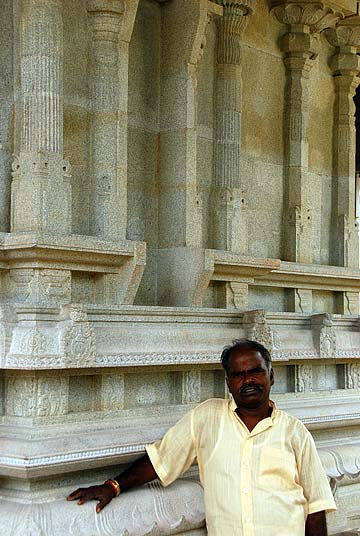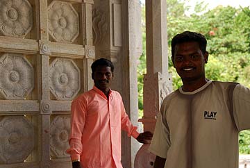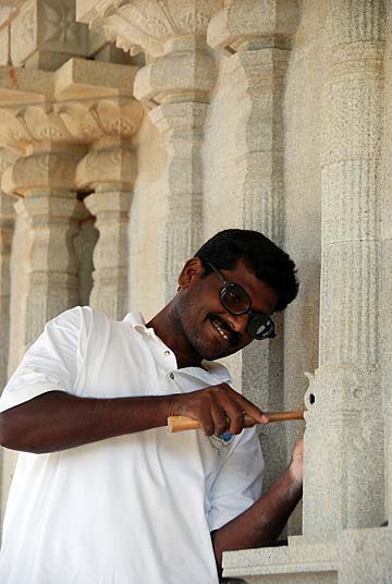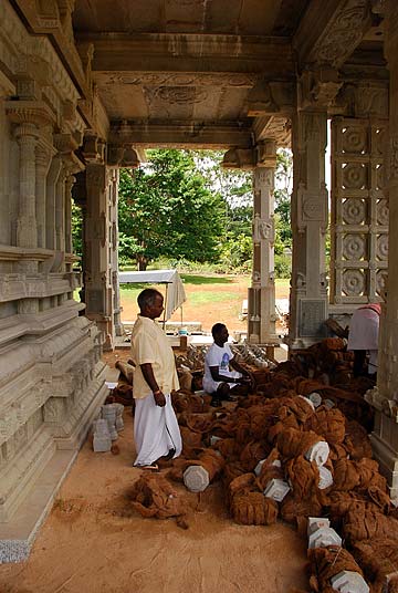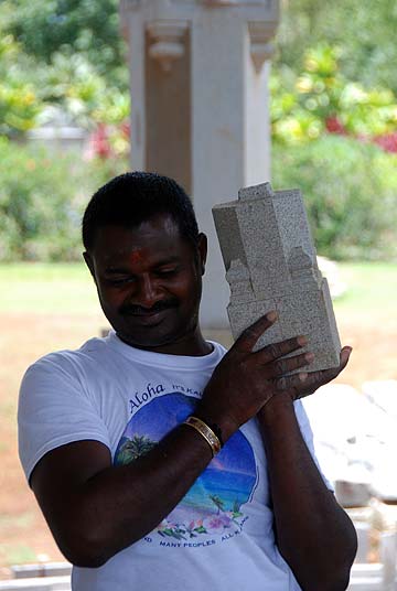 When we returned to Chennai, we made a trip to nearby Mahabalipuram. This seaside town is a major source of black granite and is famous for carving. The six silpis who have been working on the temple on Kauai the past two years have been on vacation in India for a month. They have joined us for this visit and will return with us to Kauai. On the right in the red kurta is Gunalan Ponniah, a staunch devotee of Gurudeva and Bodhinatha originally from Malaysia and now living in Chennai.