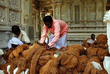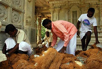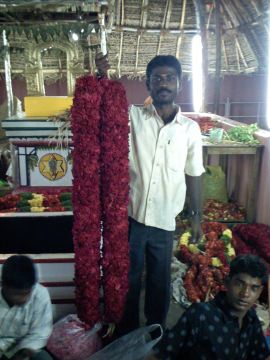 It was Thursday night, so the highly skilled professional garland makers were set up to work through the night to make enough garlands for Friday worship at the ashram's powerful and popular Rajarajeshwari Temple.