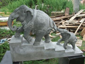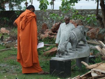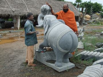 Yoginathaswami and Jiva Rajasankara examine the cement model for the cow and calf elephants that will also be made three times this size, also for Iraivan Temple's steps.