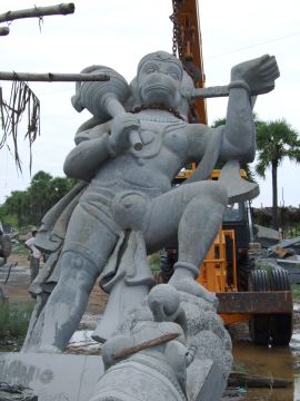 Hanuman will hold a small marble model of Iraivan Temple that is being carved up north in Rajasthan.