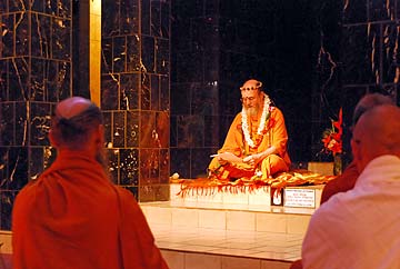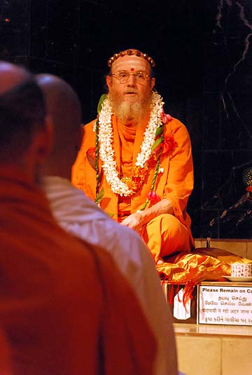 He gave bhasya on the lesson of the day on "anava marga," a term Gurudeva coined to describe the thinking of people who have yet to get on the spiritual path. He explained how such people only start on the spiritual path when they realize the Deity is so much greater than they are, and become humble. Before then, the ego is ruling.