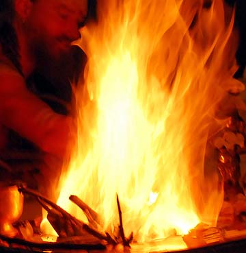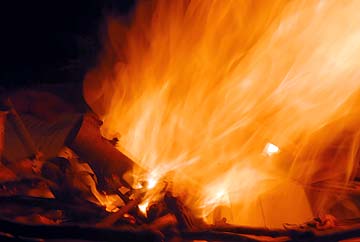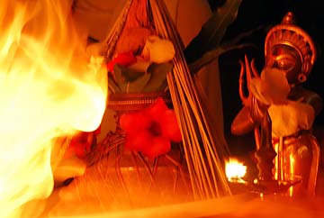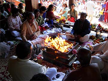 Four kulapaties sit around the Homa and help in burning the prayers brought by devotees into the sacred fire.