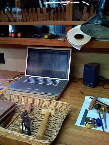 Our carpentry shop is in high gear on the retreats. Kumarswami keeps his Mac at hand. Training videos and web sites provide a lot of useful guidance from master craftsmen around the world.