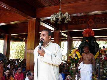 Kulapati Moorghen making an announcement regarding food sponsorship from devotees for Ganesha Chaturthi.
