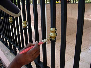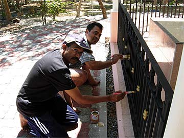Ananda and a friend painting the railings at the small Pancha Ganapati shrine...