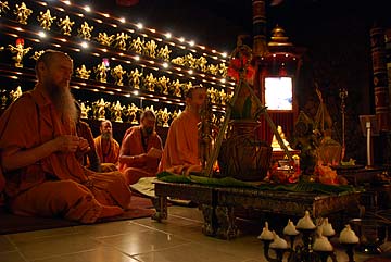 Monks all sit on the right side of the temple in front of Lord Muruga, listening to Bodhinatha. Sadhaka Satyanatha has the recording duties.