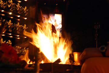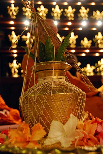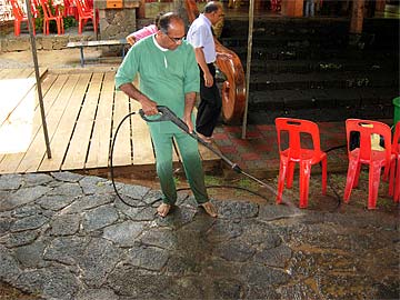 On the eve a team is giving the final touches to the preparations. Kulapati Manon is washing the lava rock paths leading to the Mandapam.