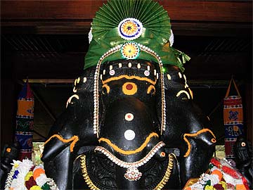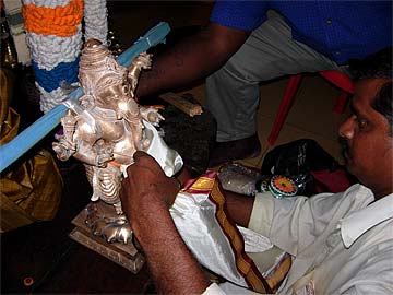 This brass Ganesha murthi is being dressed for the parade by one volunteer from the Chebel Temple...