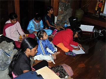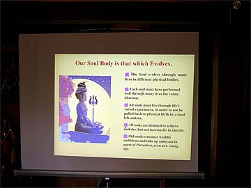 In another part of our Dharmasala lobby, converted into a teaching hall, our youth are having their usual Saivite Hindu Religion class. They are learning from Bodhinatha the concept of the soul body, which is eternal and never dies.