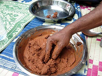 The youth are taught how to mix the clay and water into a sticky paste.